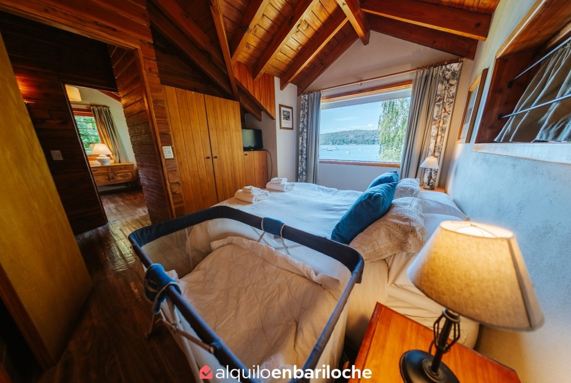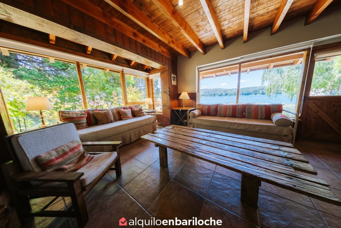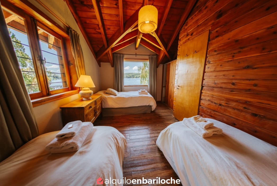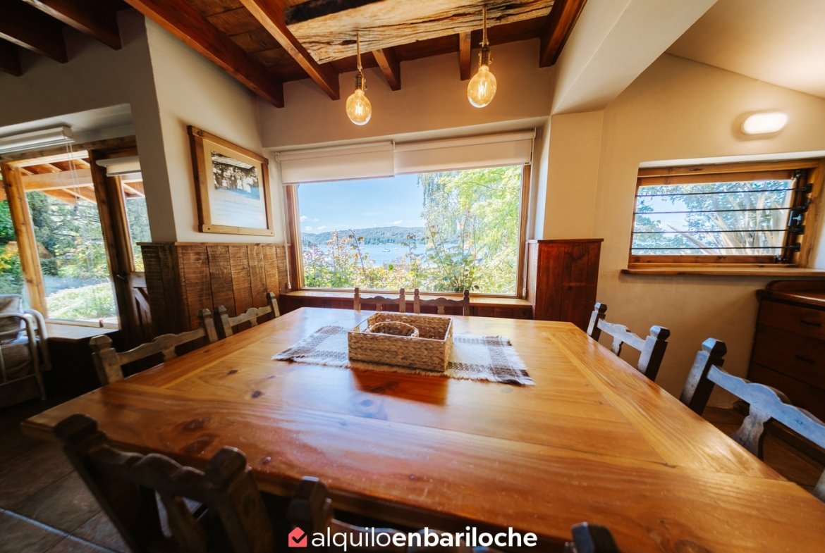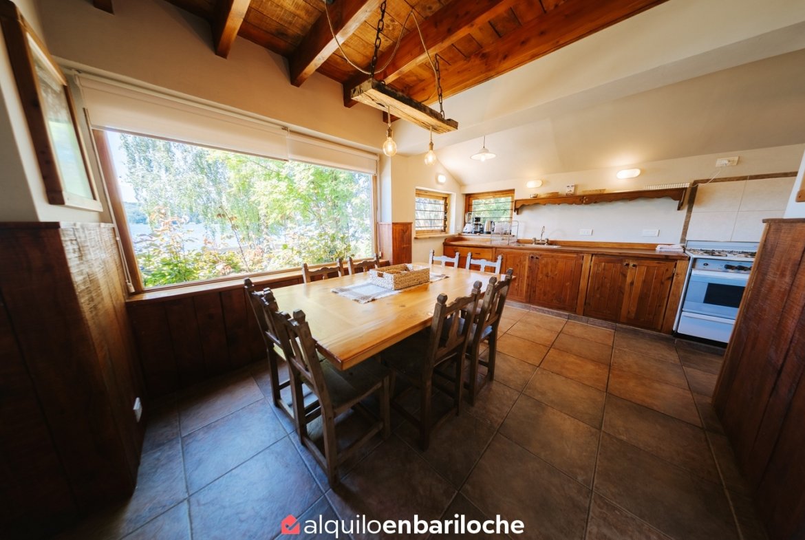 Ubicada sobre la costa del lago Nahuel Huapi, a la altura del km 13 de Av. Bustillo, esta cabaña posee dos habitaciones y dos baños (uno en suite en la habitación principal), estar con hogar a leña, comedor, cocina, calefacción central.