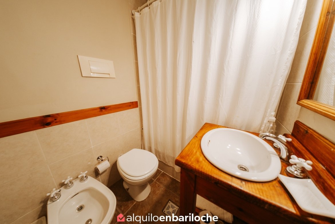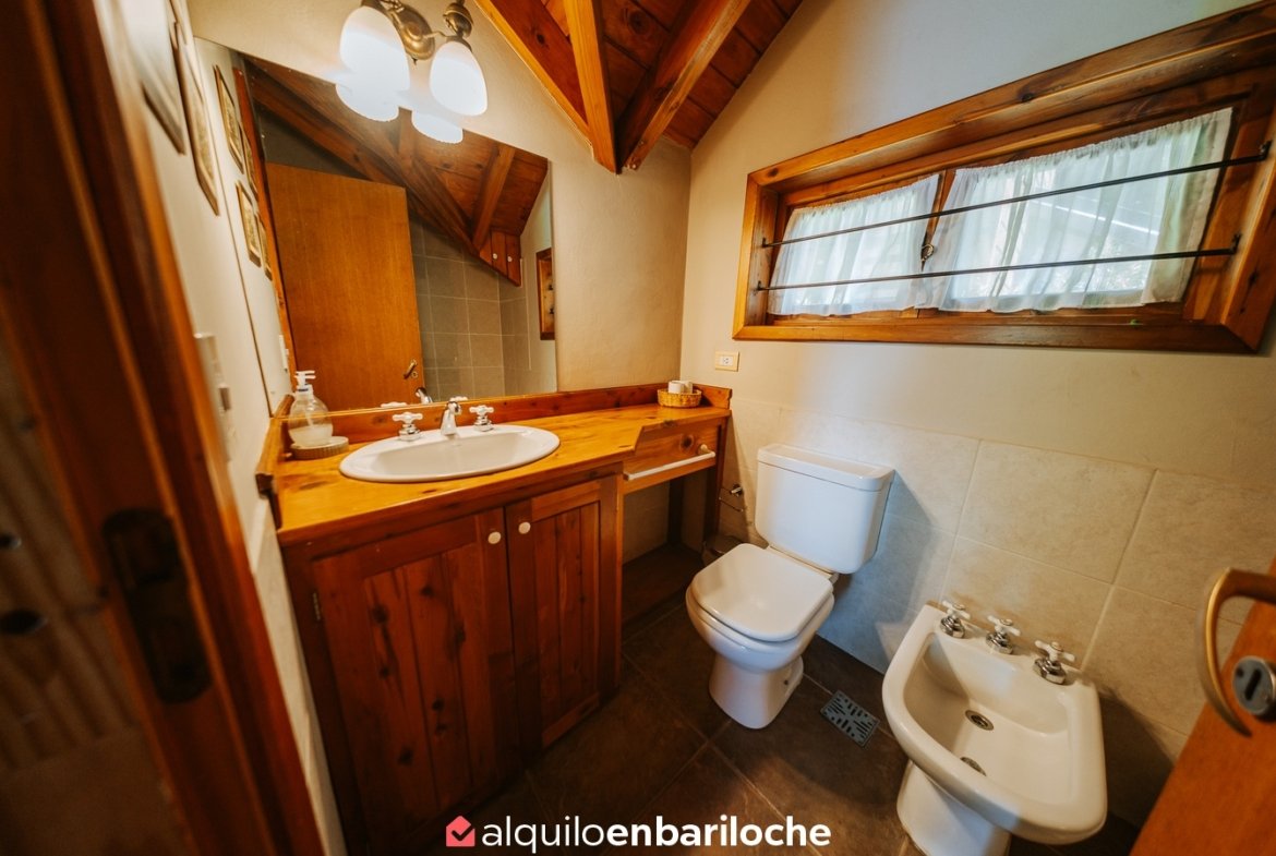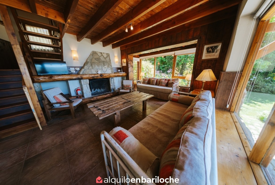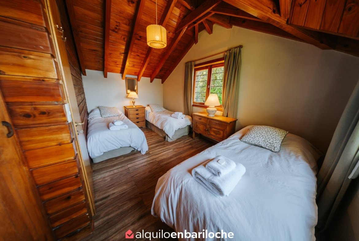 Ubicada sobre la costa del lago Nahuel Huapi, a la altura del km 13 de Av. Bustillo, esta cabaña posee dos habitaciones y dos baños (uno en suite en la habitación principal), estar con hogar a leña, comedor, cocina, calefacción central.