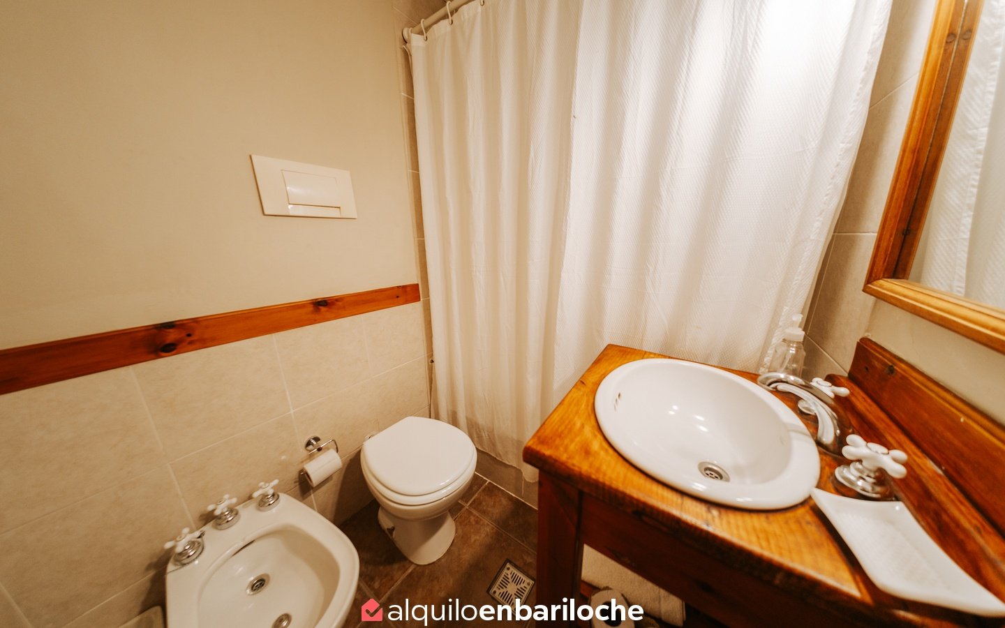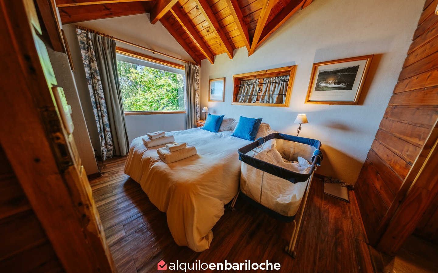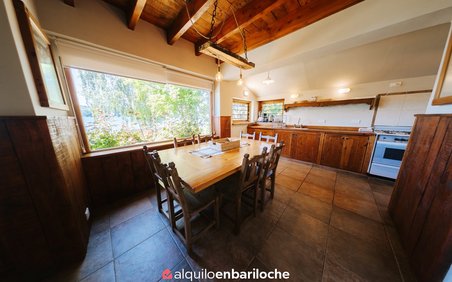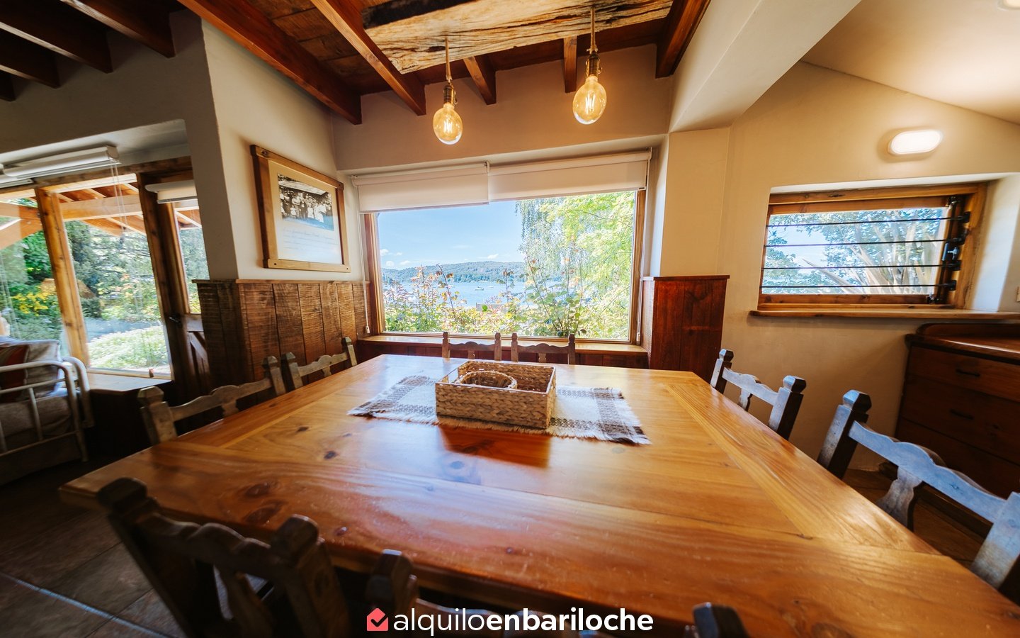 Ubicada sobre la costa del lago Nahuel Huapi, a la altura del km 13 de Av. Bustillo, esta cabaña posee dos habitaciones y dos baños (uno en suite en la habitación principal), estar con hogar a leña, comedor, cocina, calefacción central.