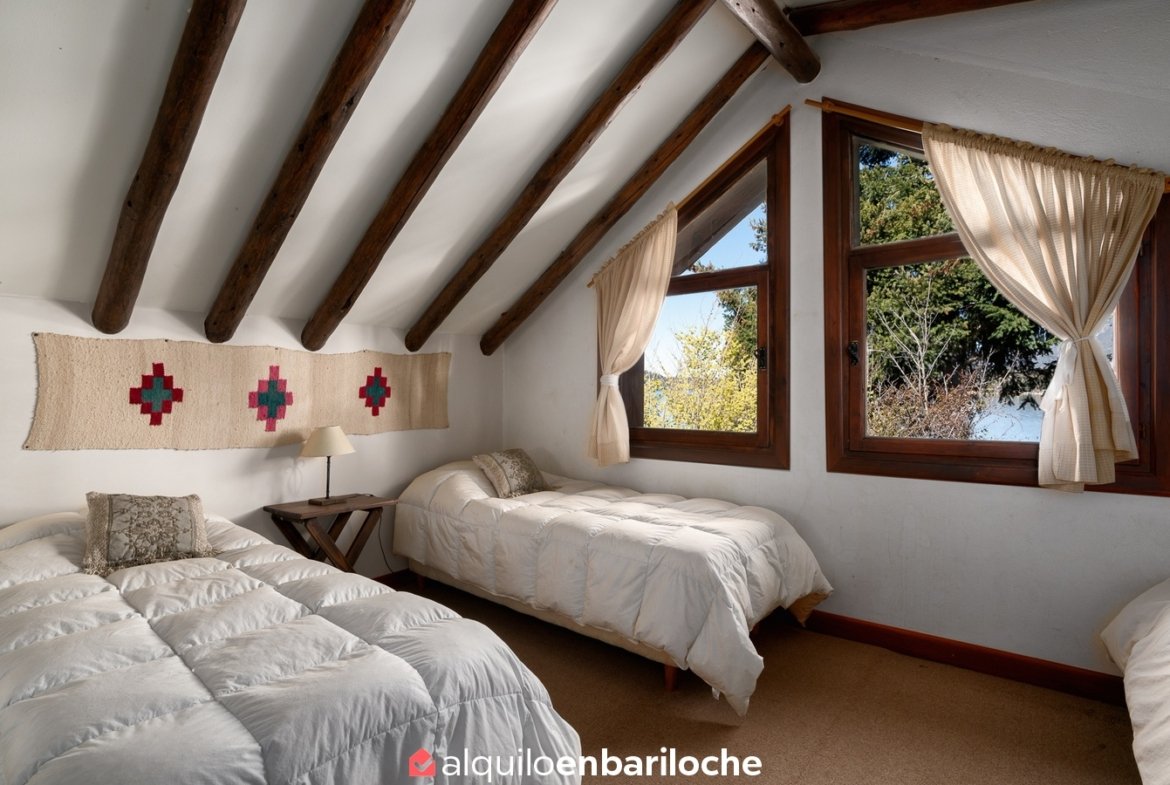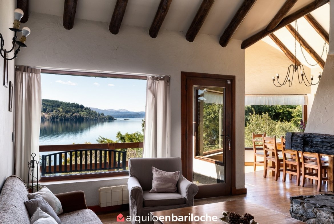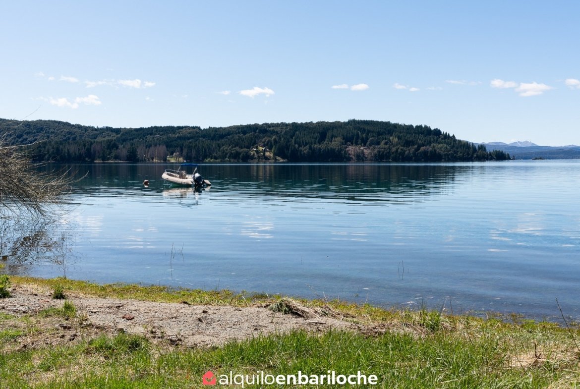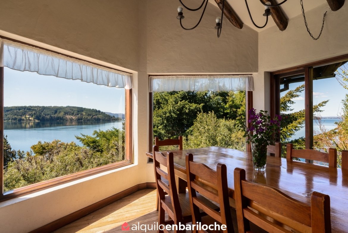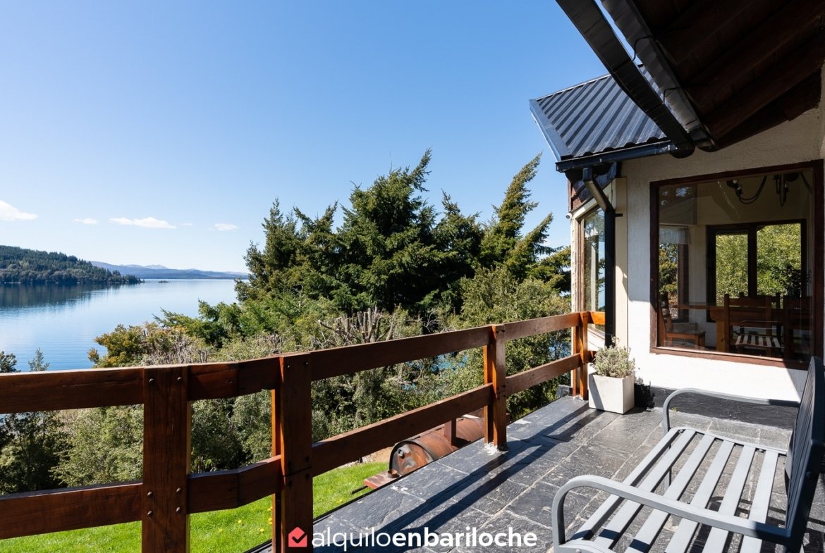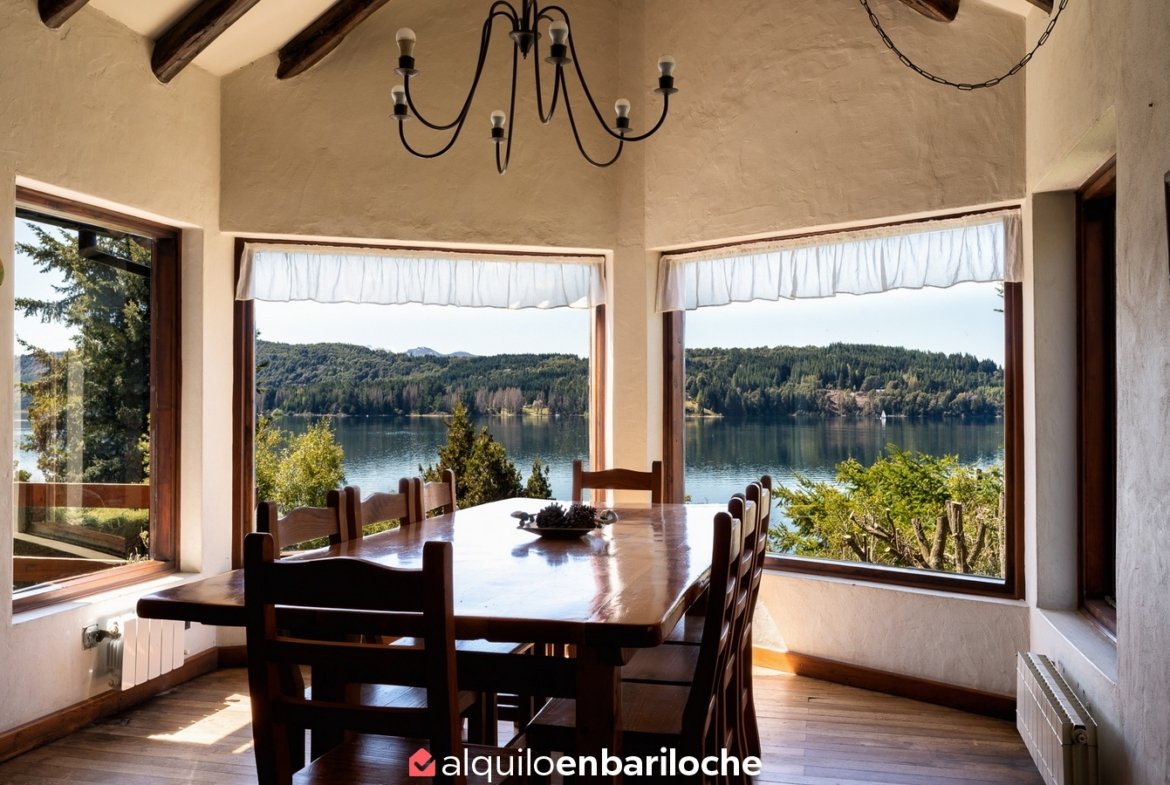 Alquiler casa en Bariloche sobre el lago Nahuel Huapi. Casa de dos plantas con impresionantes vistas al lago, ubicada a solo 12 km del centro de la ciudad con fácil acceso al cerro Catedral y a 15 km de Llao Llao. Con capacidad para 8 personas, esta propiedad ofrece un entorno único con acceso directo a la costa del lago Nahuel Huapi.