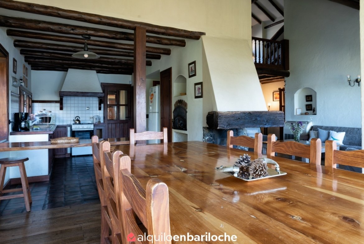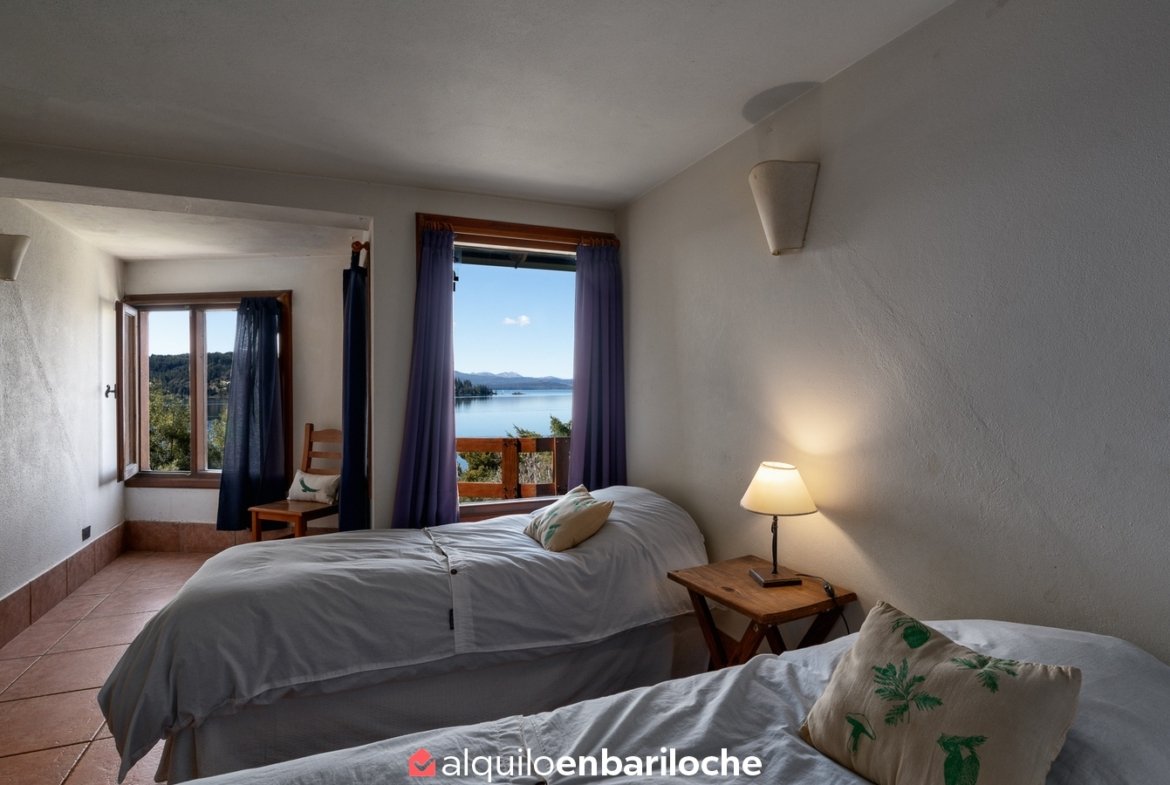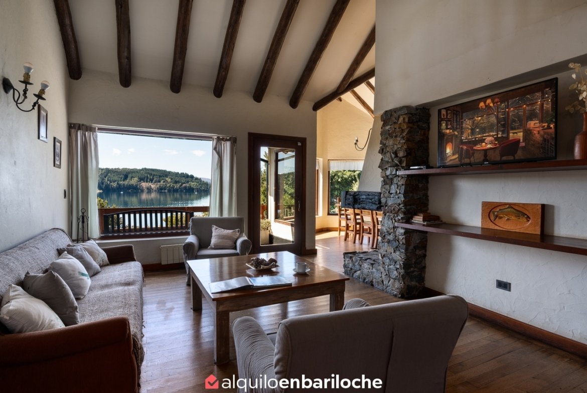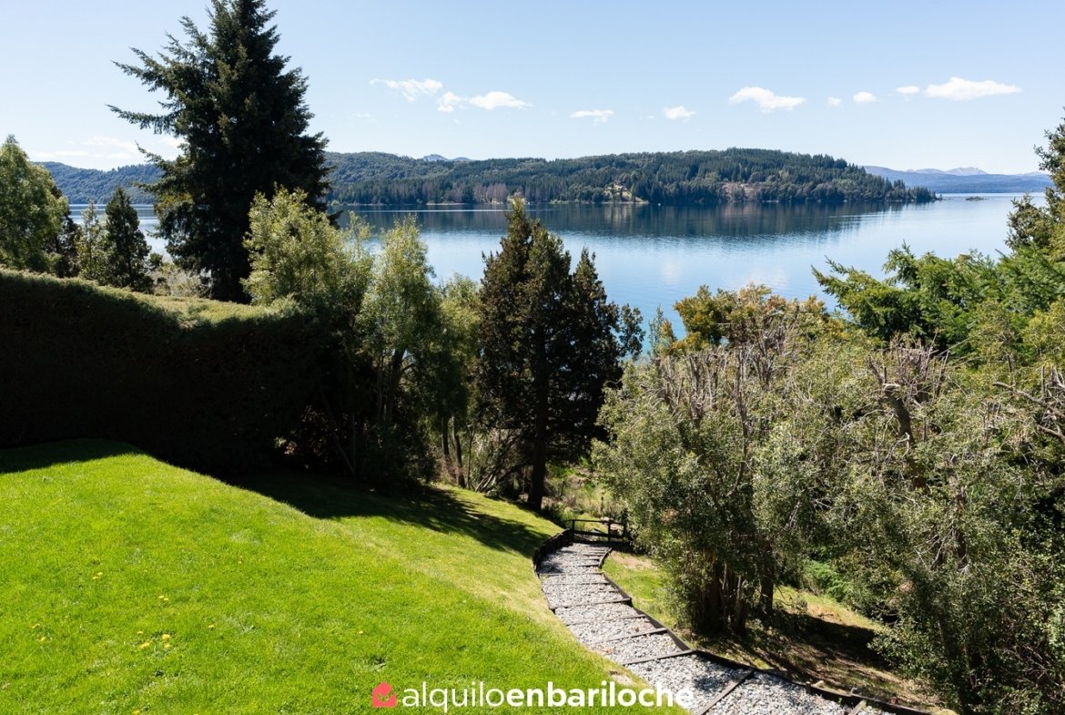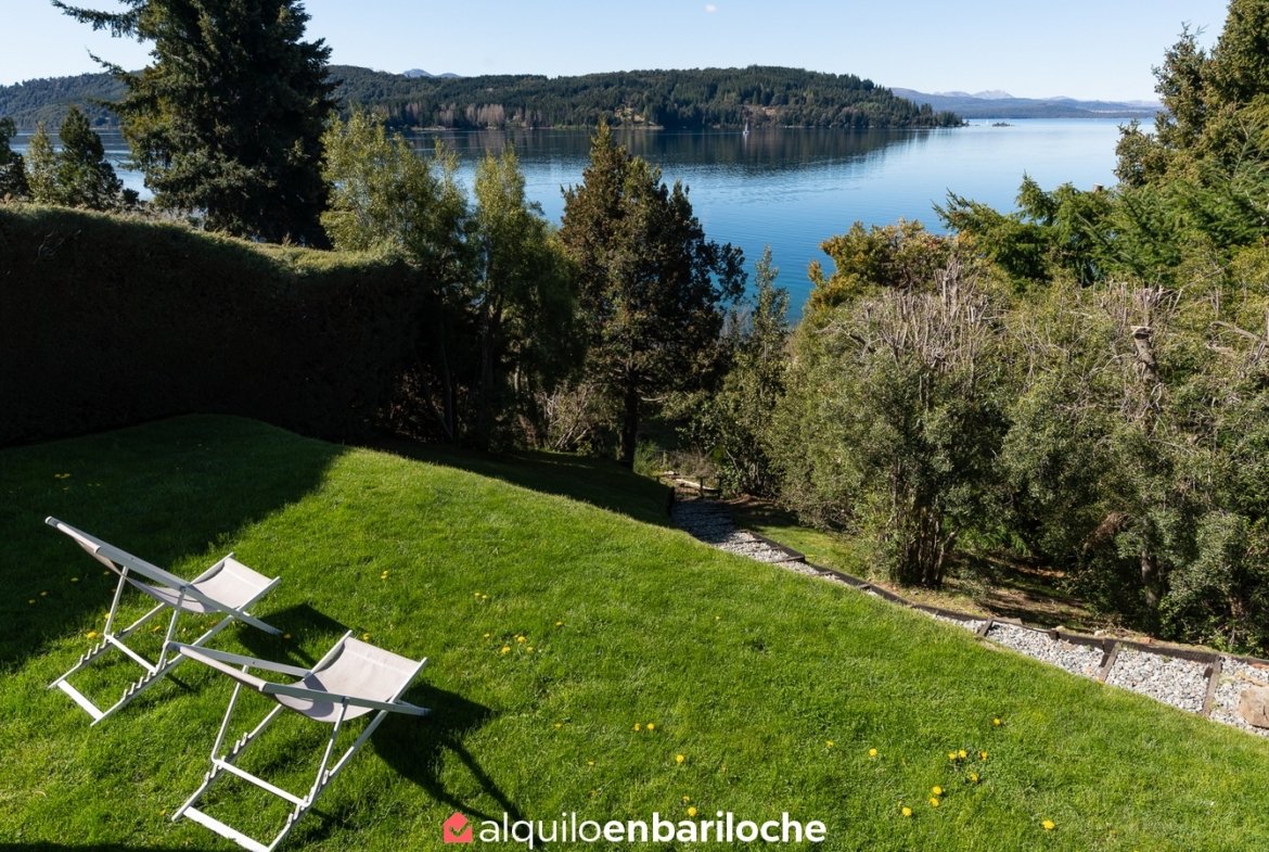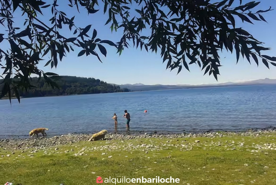 Alquiler casa en Bariloche sobre el lago Nahuel Huapi. Casa de dos plantas con impresionantes vistas al lago, ubicada a solo 12 km del centro de la ciudad con fácil acceso al cerro Catedral y a 15 km de Llao Llao. Con capacidad para 8 personas, esta propiedad ofrece un entorno único con acceso directo a la costa del lago Nahuel Huapi.