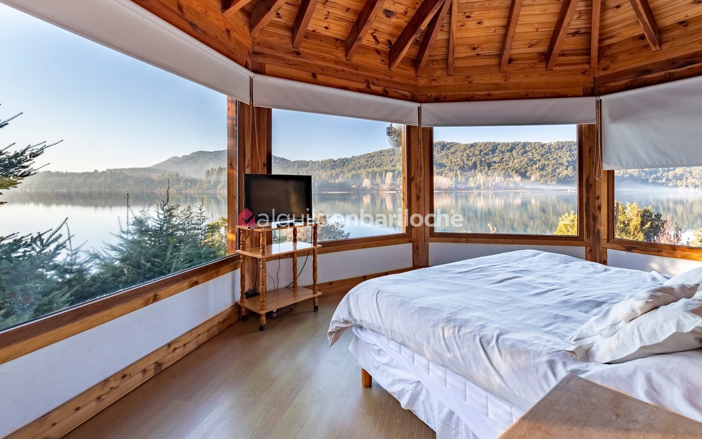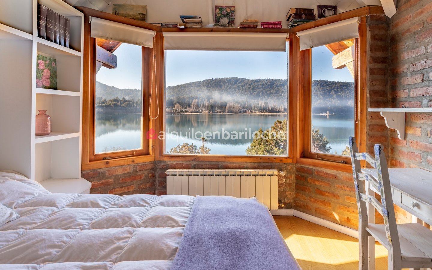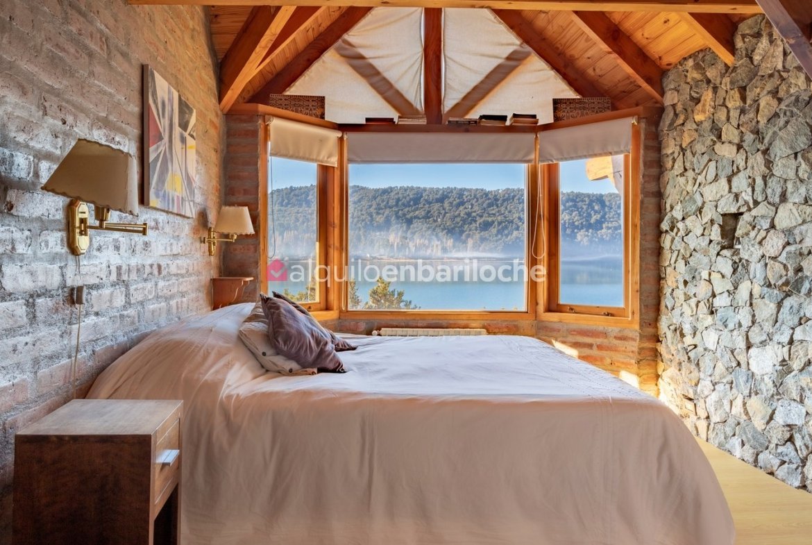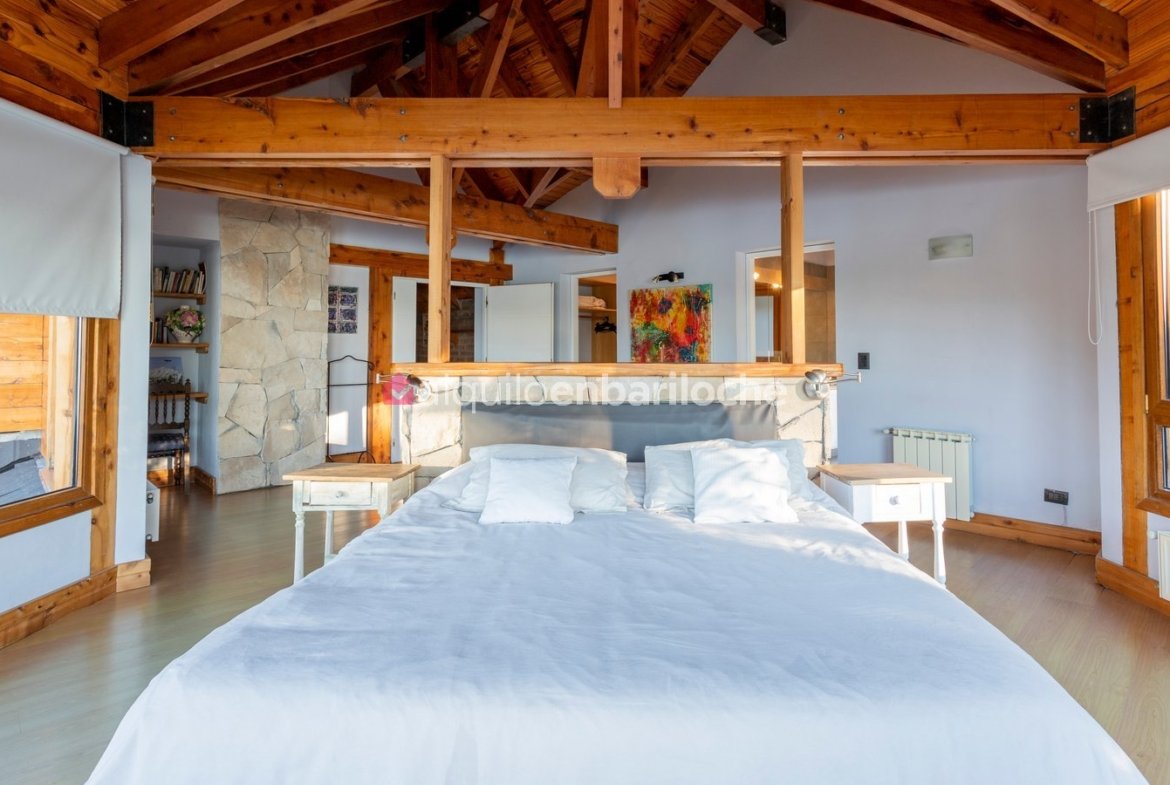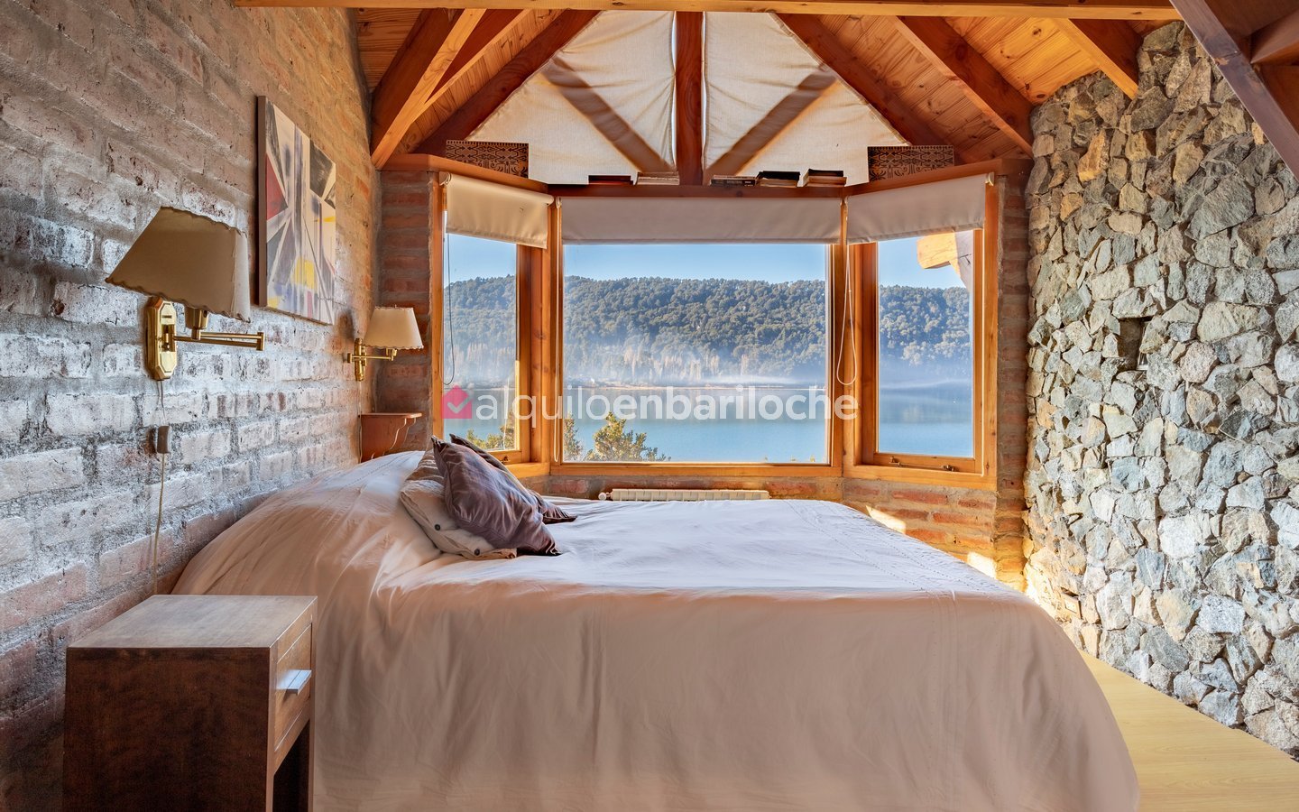 La casa ofrece capacidad para hasta 8 personas distribuidas en 4 dormitorios ubicados en planta alta, lo que garantiza independencia y silencio a la hora de descansar. La suite principal se reserva el mejor lugar: cama king, vestidor, baño en suite con hidromasaje y una vista panorámica que invita a despertarse mirando el lago.