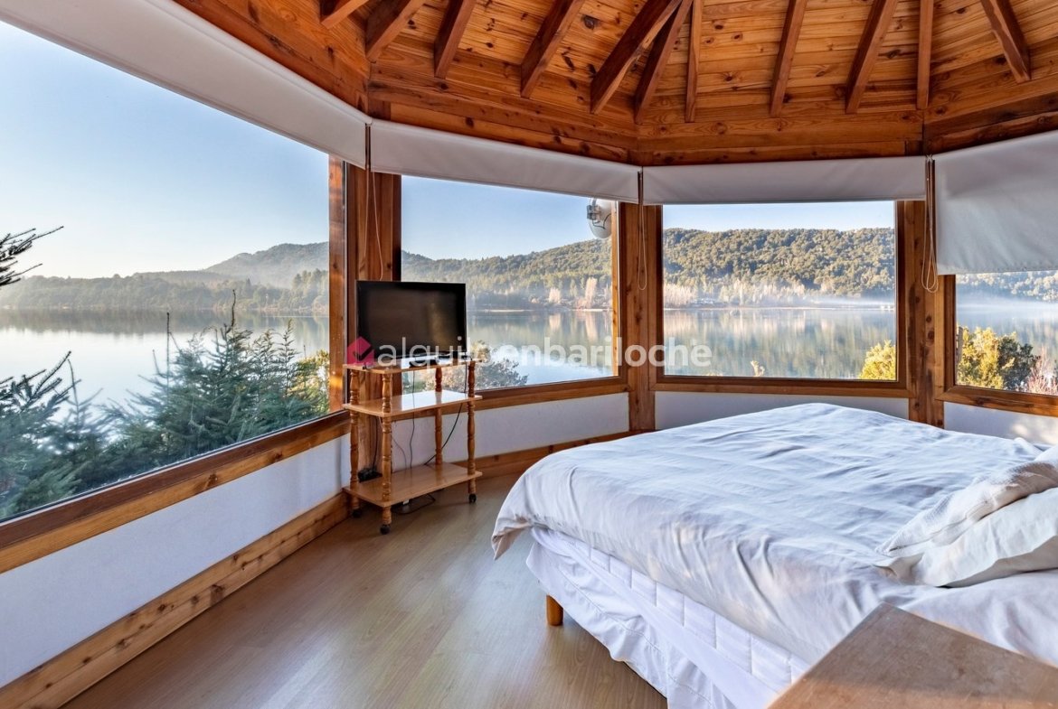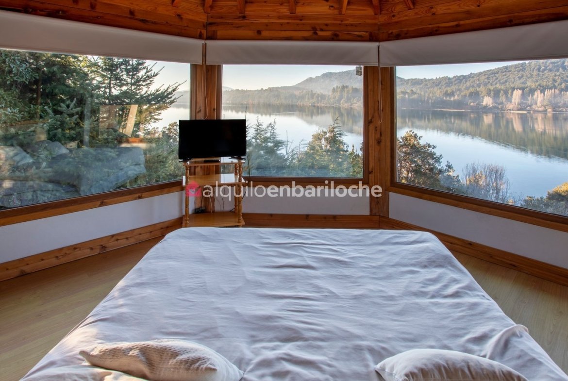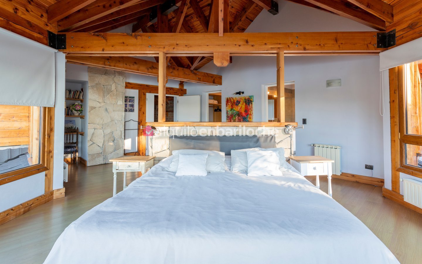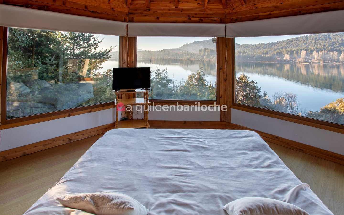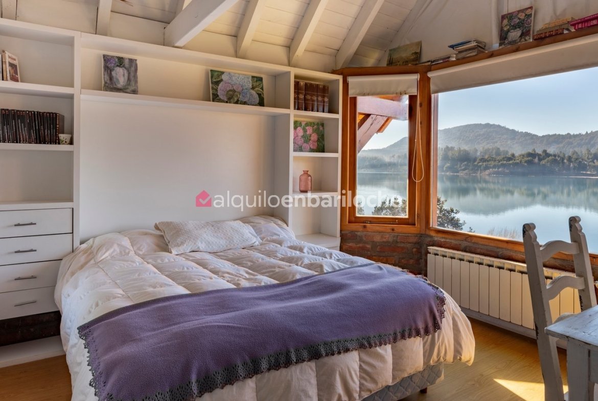 La casa ofrece capacidad para hasta 8 personas distribuidas en 4 dormitorios ubicados en planta alta, lo que garantiza independencia y silencio a la hora de descansar. La suite principal se reserva el mejor lugar: cama king, vestidor, baño en suite con hidromasaje y una vista panorámica que invita a despertarse mirando el lago.