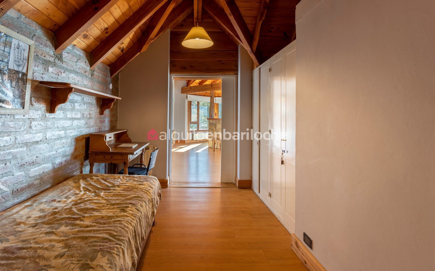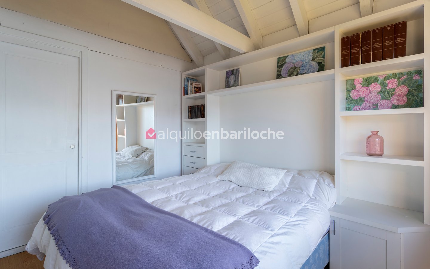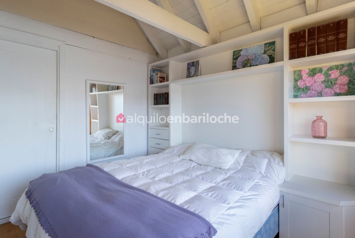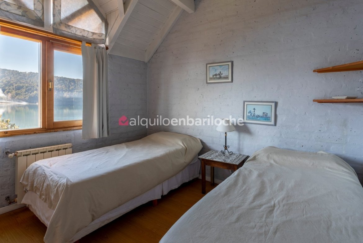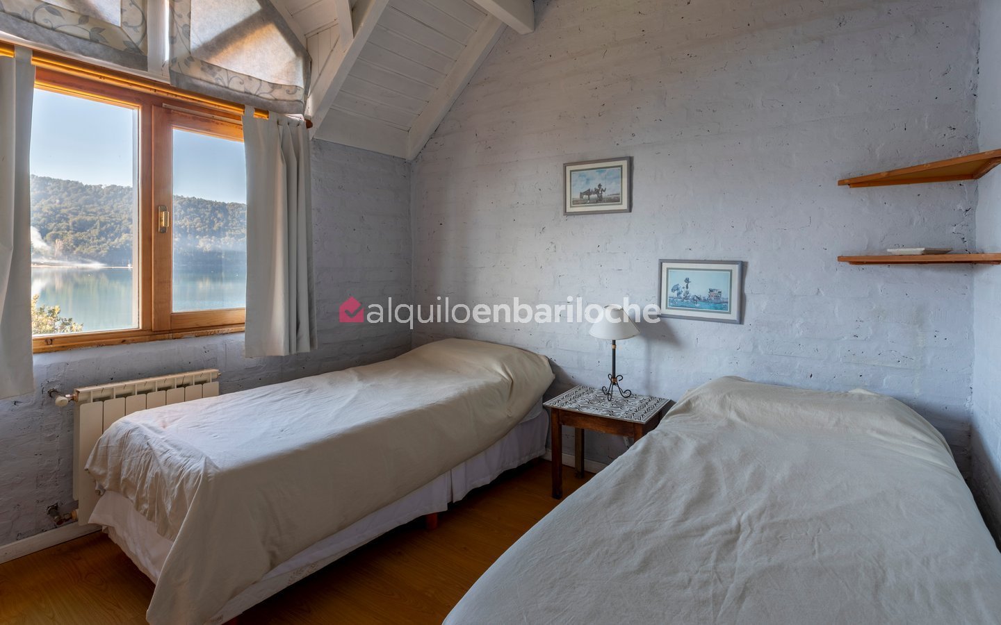 La casa ofrece capacidad para hasta 8 personas distribuidas en 4 dormitorios ubicados en planta alta, lo que garantiza independencia y silencio a la hora de descansar. La suite principal se reserva el mejor lugar: cama king, vestidor, baño en suite con hidromasaje y una vista panorámica que invita a despertarse mirando el lago.