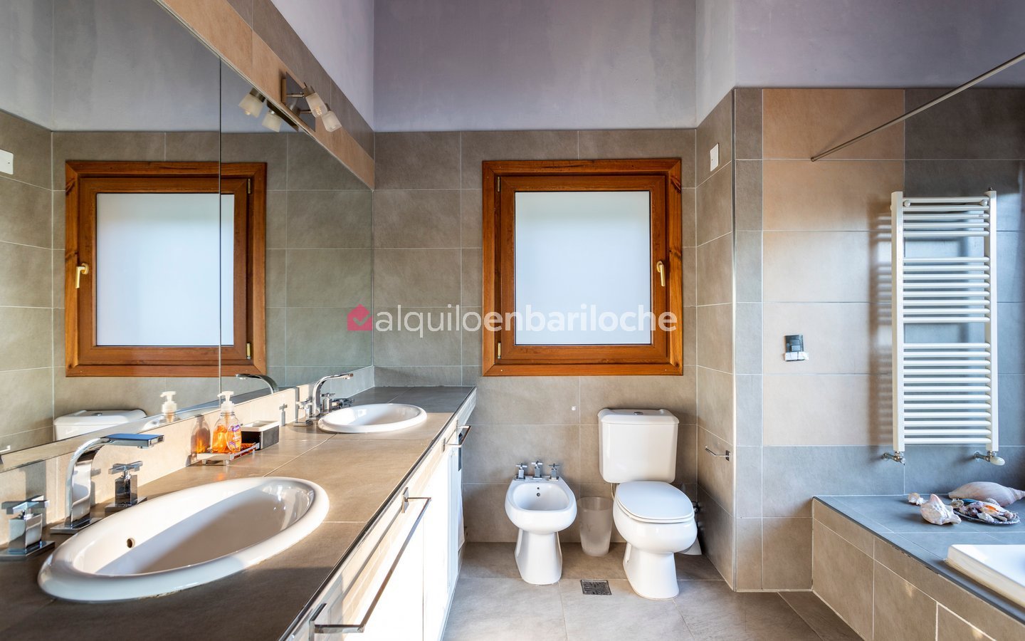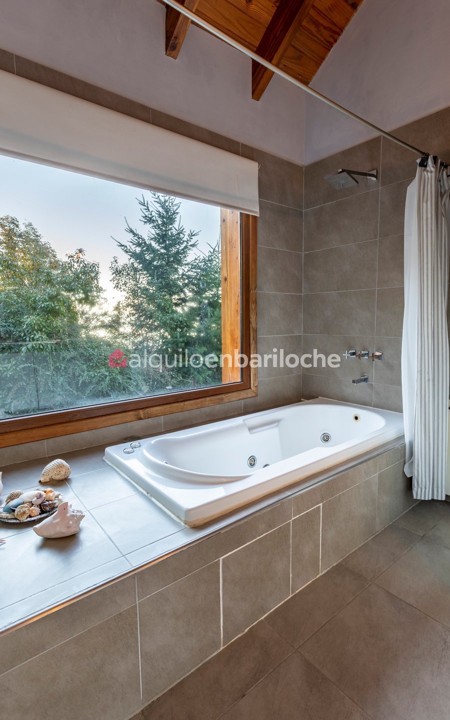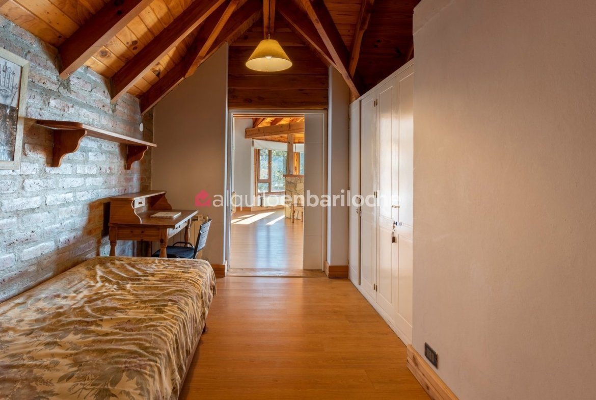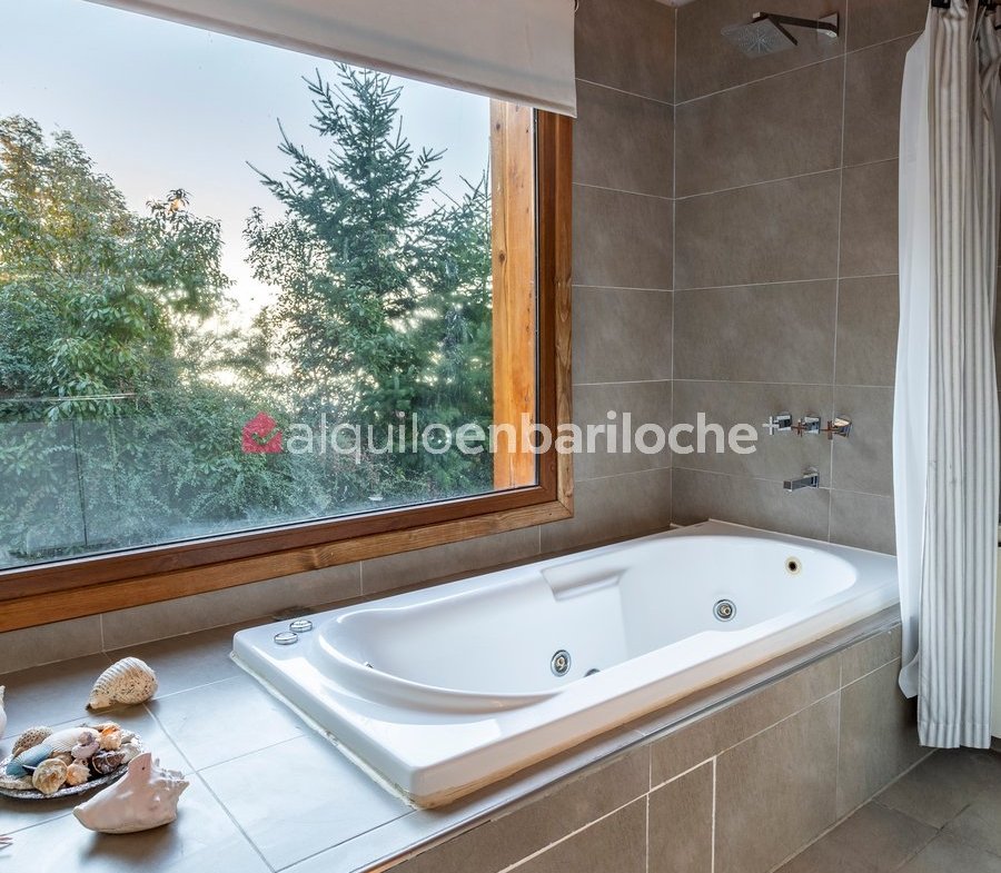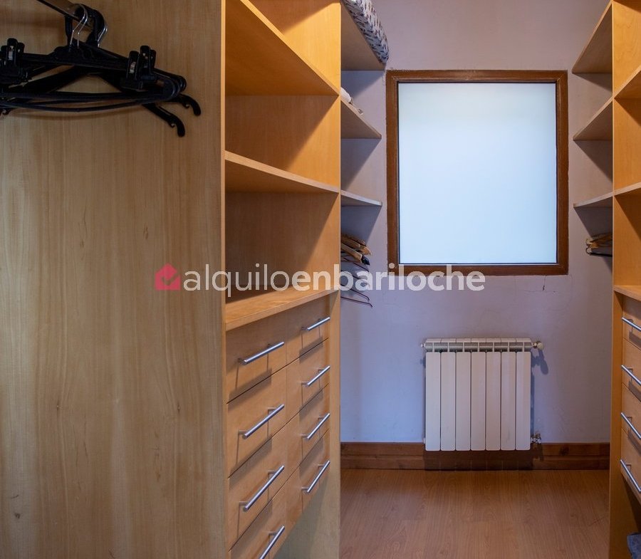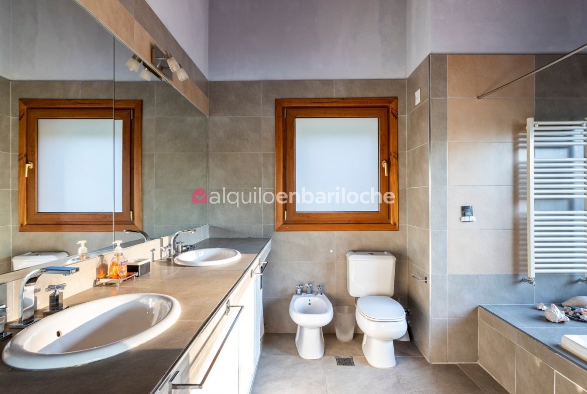 La casa ofrece capacidad para hasta 8 personas distribuidas en 4 dormitorios ubicados en planta alta, lo que garantiza independencia y silencio a la hora de descansar. La suite principal se reserva el mejor lugar: cama king, vestidor, baño en suite con hidromasaje y una vista panorámica que invita a despertarse mirando el lago.