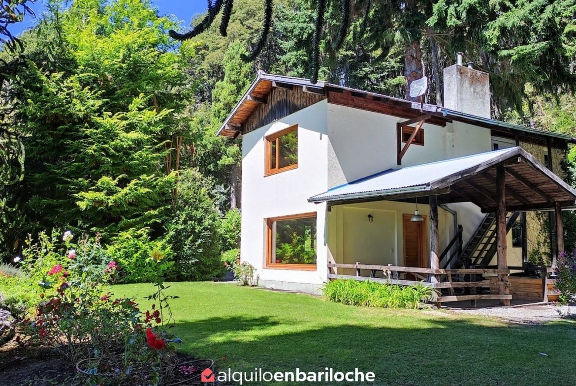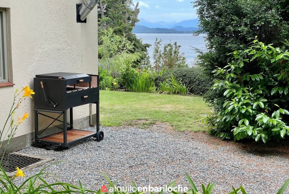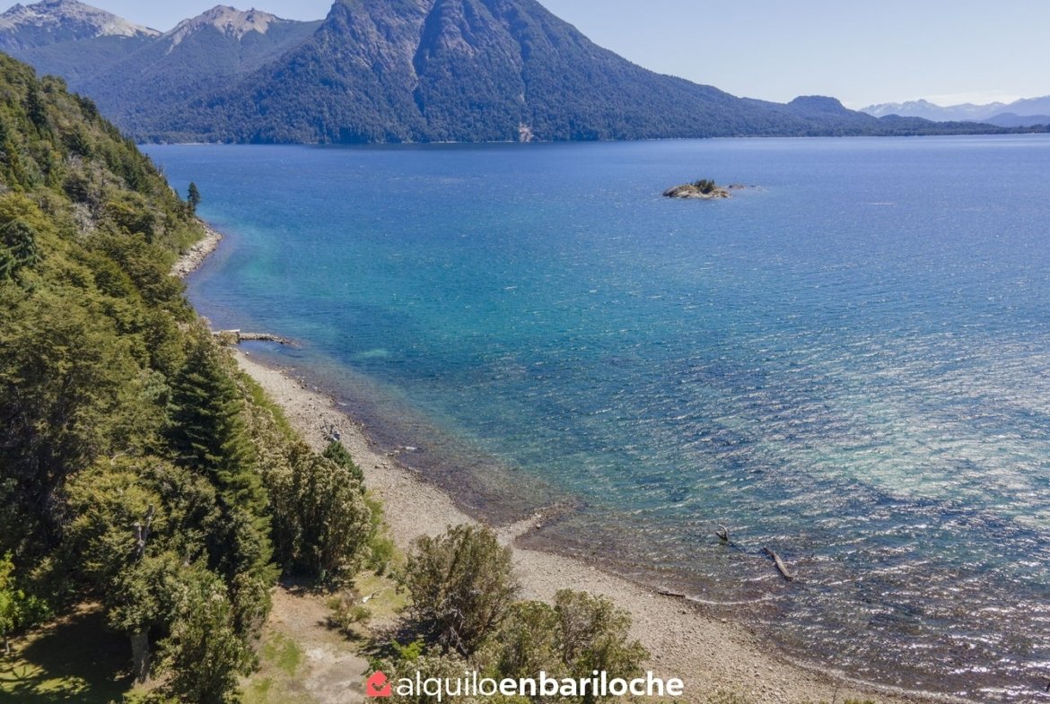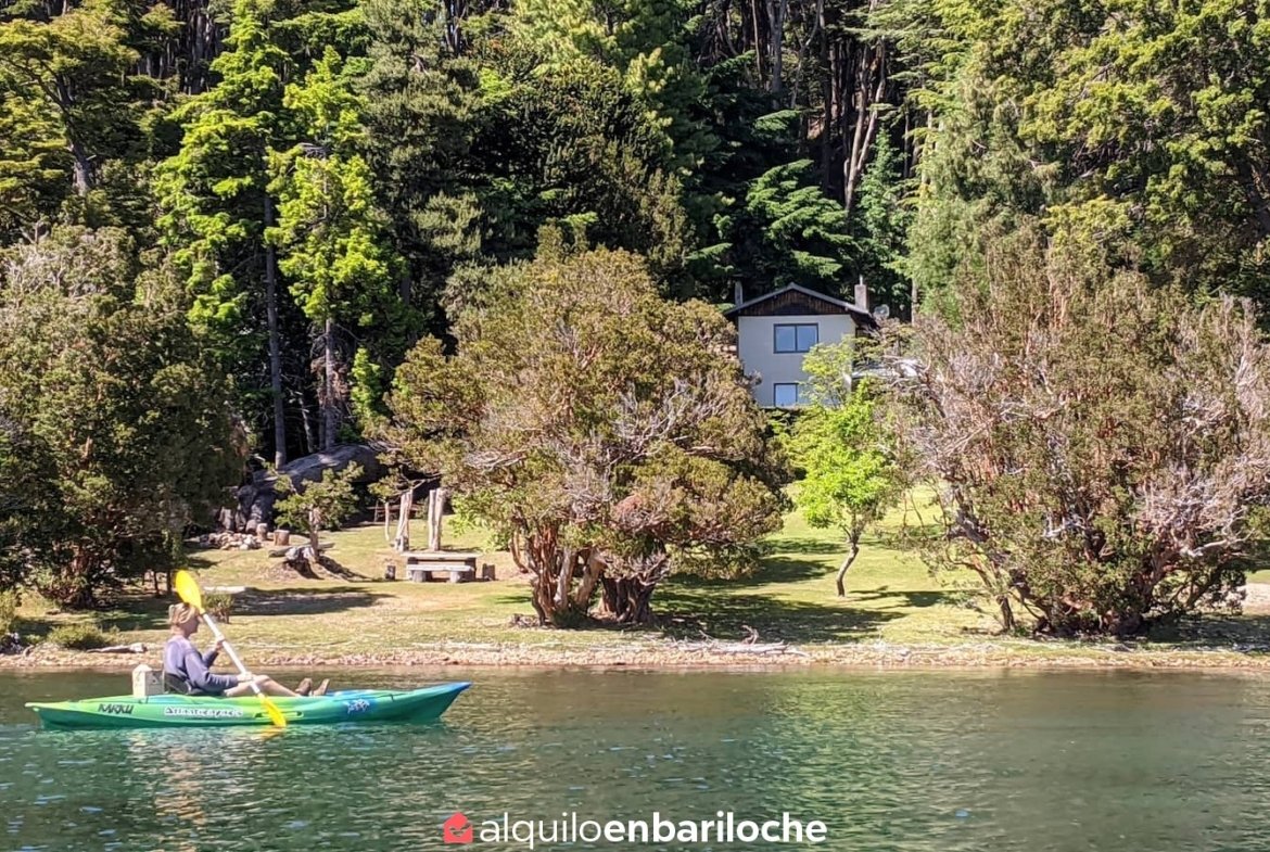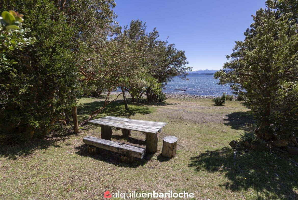 Casa de dos plantas unidas entre sí por una escalera externa techada. Ubicada sobre el lago Nahuel Huapi, con inmejorable vista, en un gran jardín de poca pendiente, con costa propia, parrilla-fogonero y mesa entre los Arrayanes sobre la costa, para disfrutar de la naturaleza.