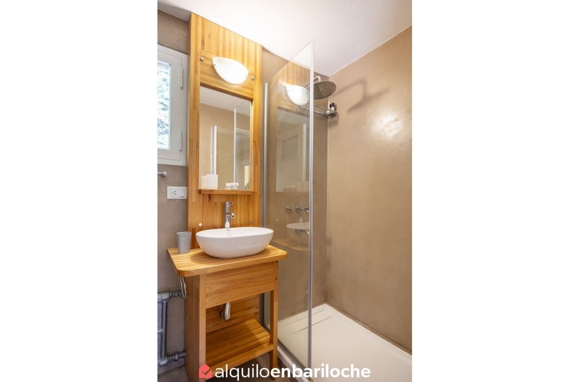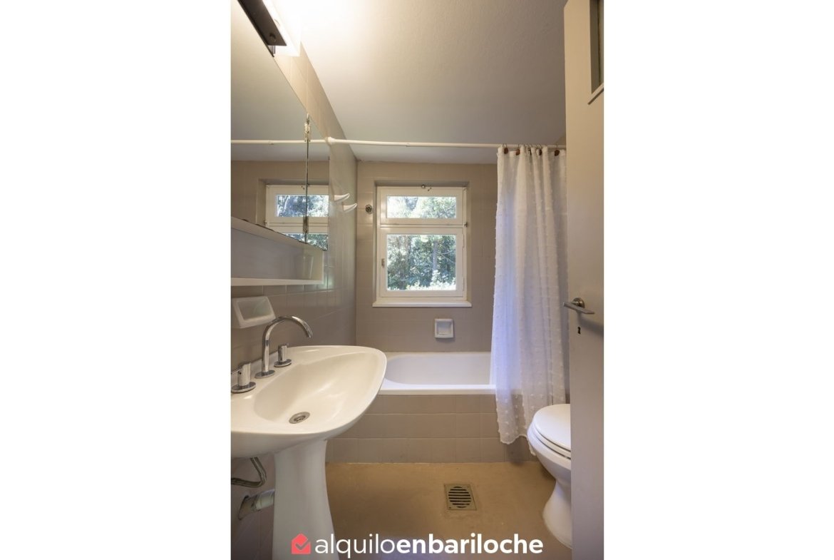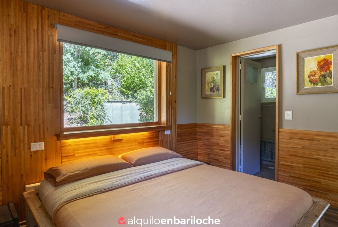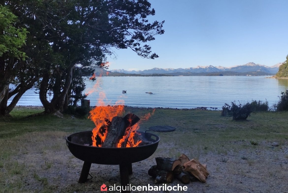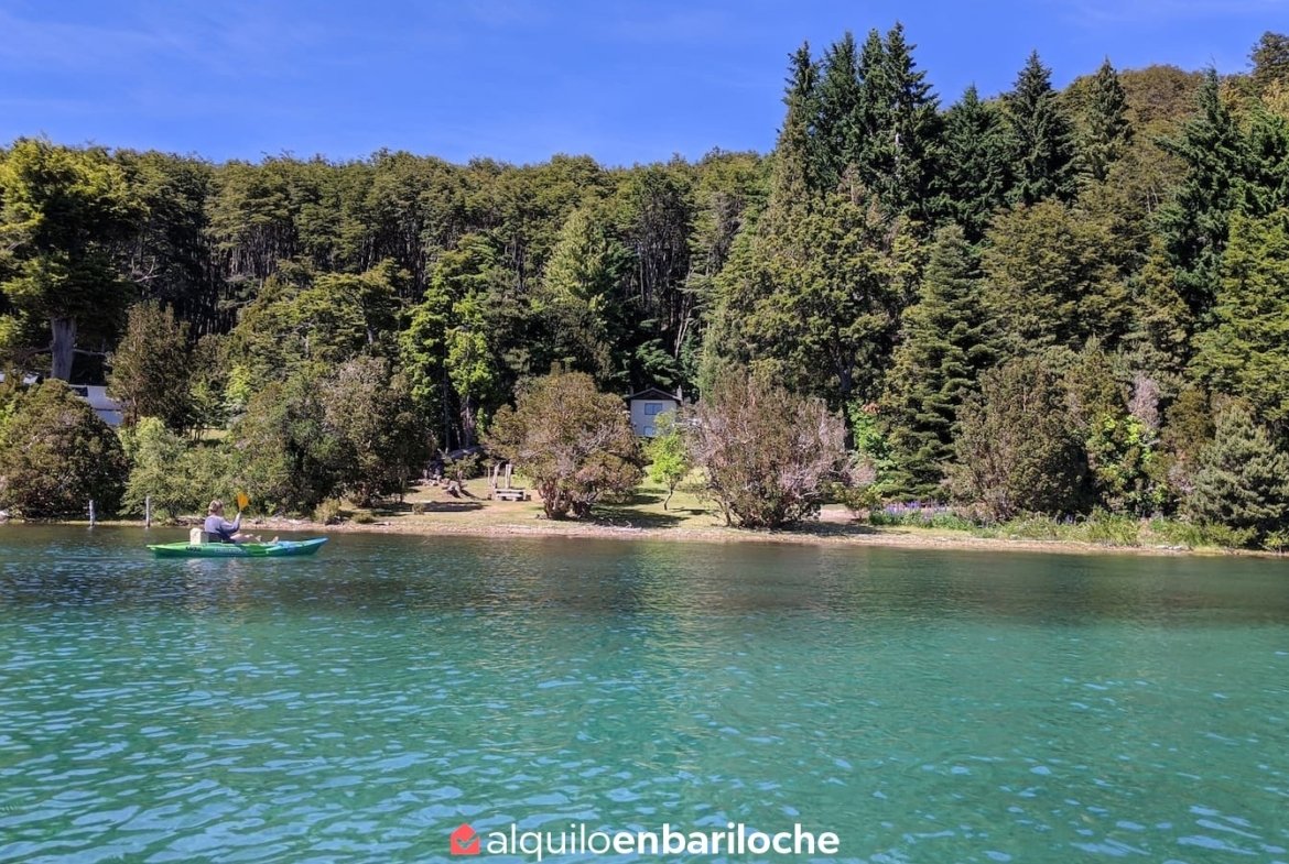 Casa de dos plantas unidas entre sí por una escalera externa techada. Ubicada sobre el lago Nahuel Huapi, con inmejorable vista, en un gran jardín de poca pendiente, con costa propia, parrilla-fogonero y mesa entre los Arrayanes sobre la costa, para disfrutar de la naturaleza.