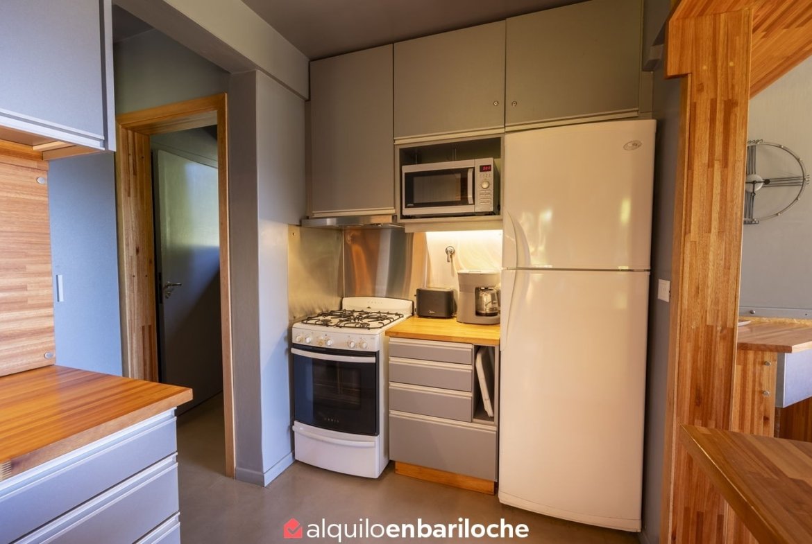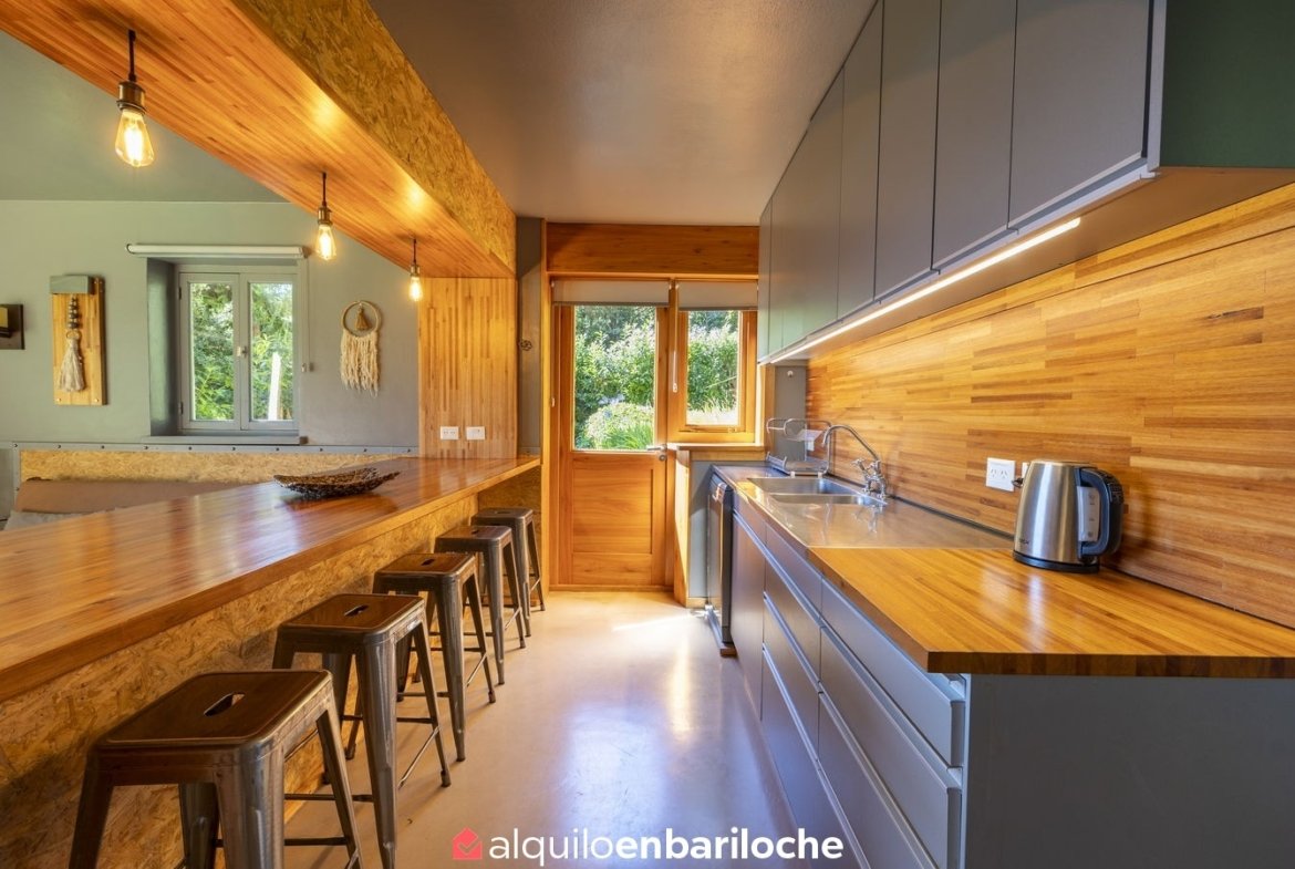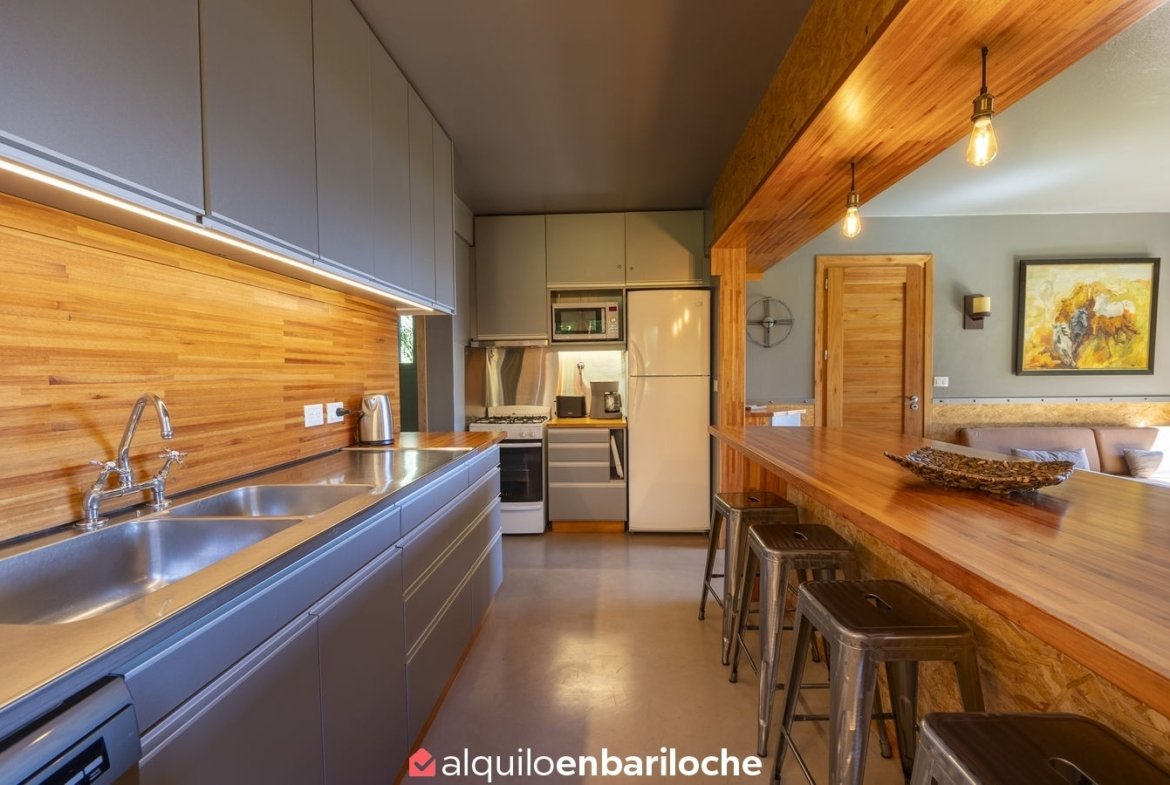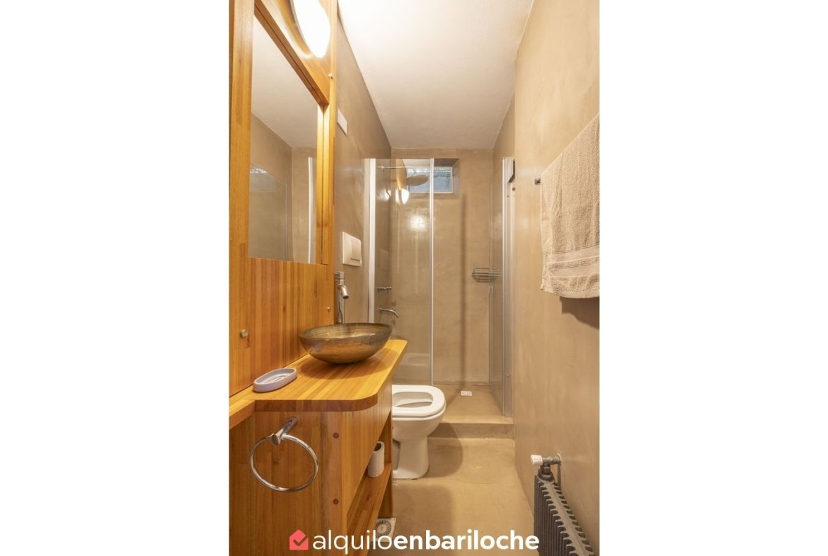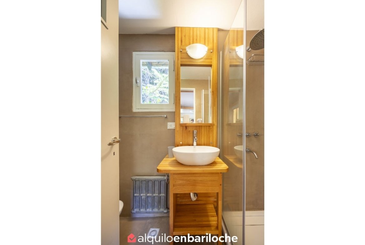Casa de dos plantas unidas entre sí por una escalera externa techada. Ubicada sobre el lago Nahuel Huapi, con inmejorable vista, en un gran jardín de poca pendiente, con costa propia, parrilla-fogonero y mesa entre los Arrayanes sobre la costa, para disfrutar de la naturaleza.