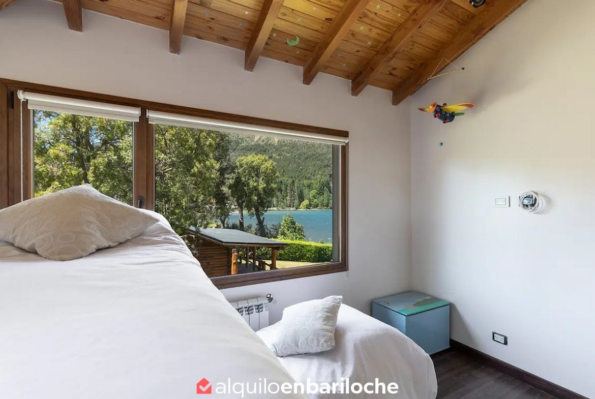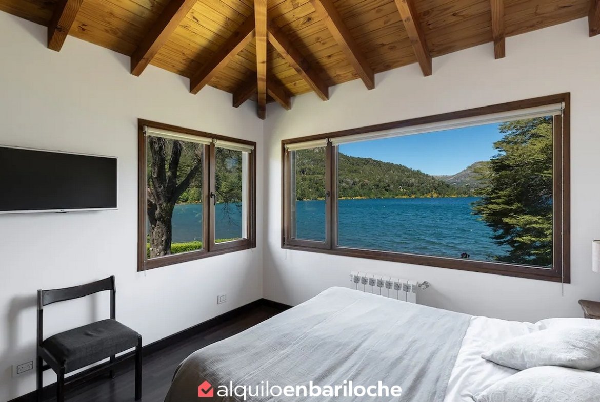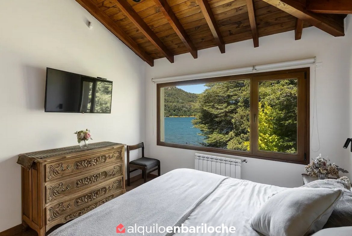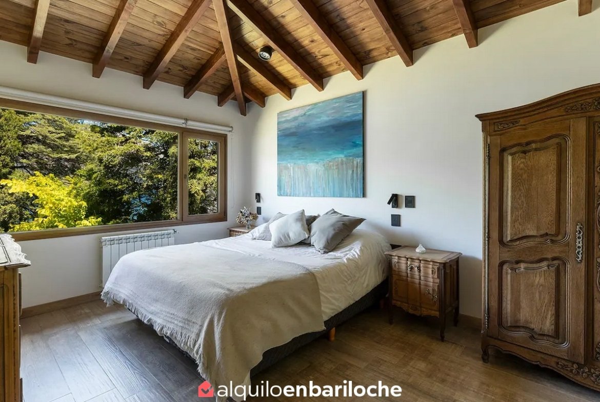 - Dormitorio 1: cama matrimonial, baño en suite, vista al lago, cortinas blackout.