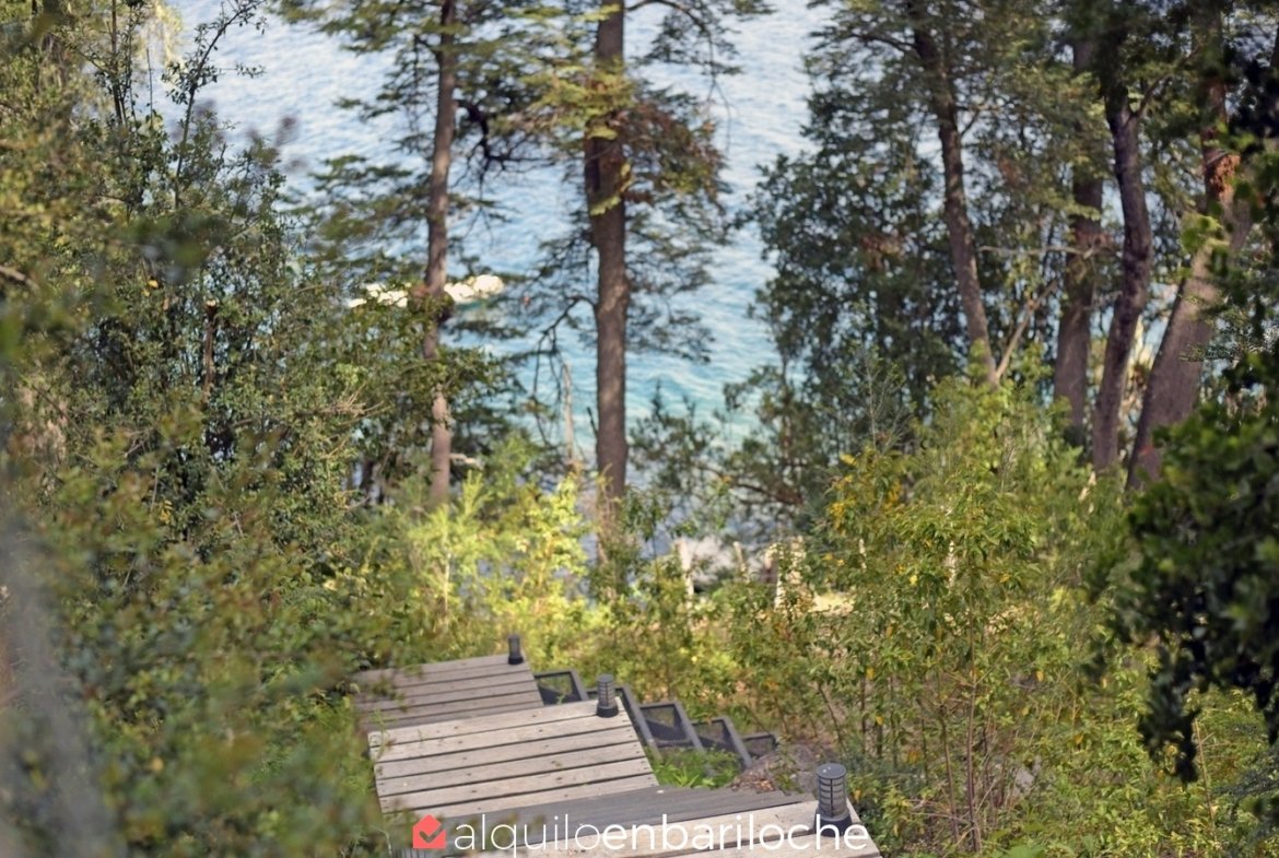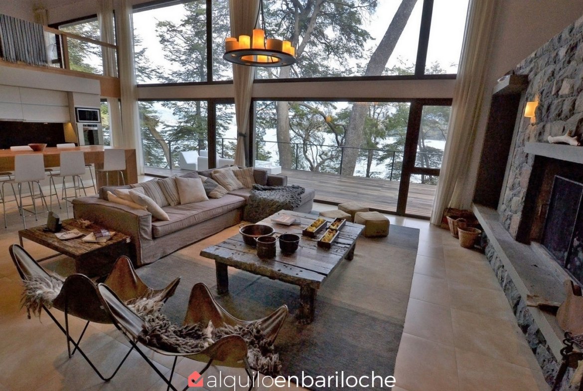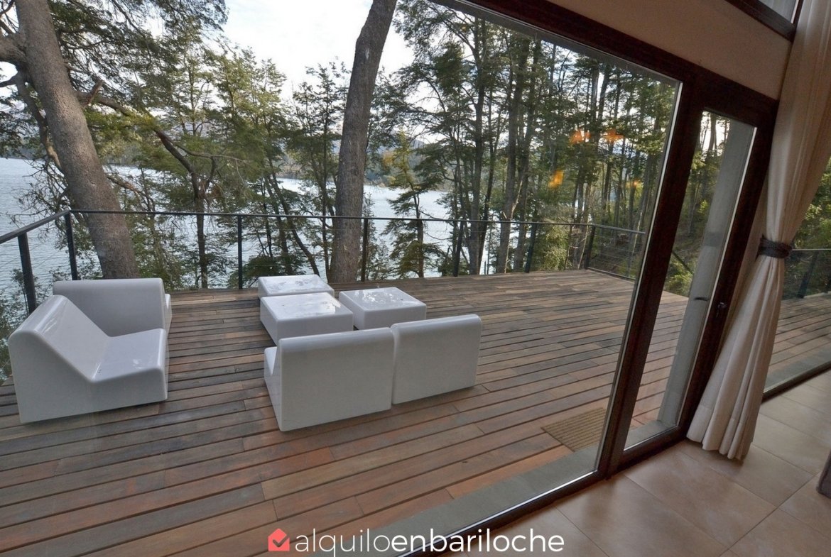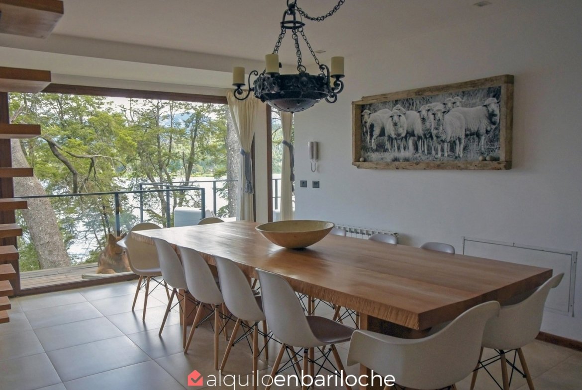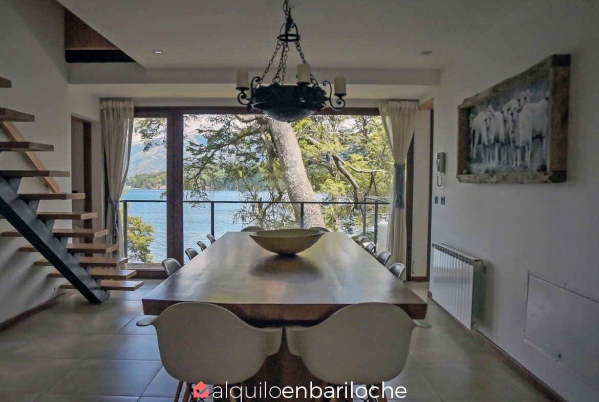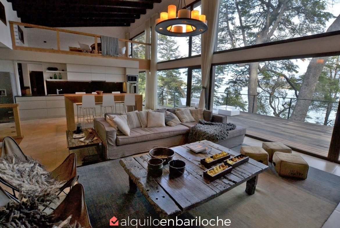 En la exclusiva Península de San Pedro, esta residencia de tres plantas frente al lago Nahuel Huapi ofrece seis dormitorios, un amplísimo deck con vistas panorámicas y acceso a la playa. Ideal para familias de hasta 12 personas que buscan confort, privacidad y conexión con la naturaleza en Bariloche.