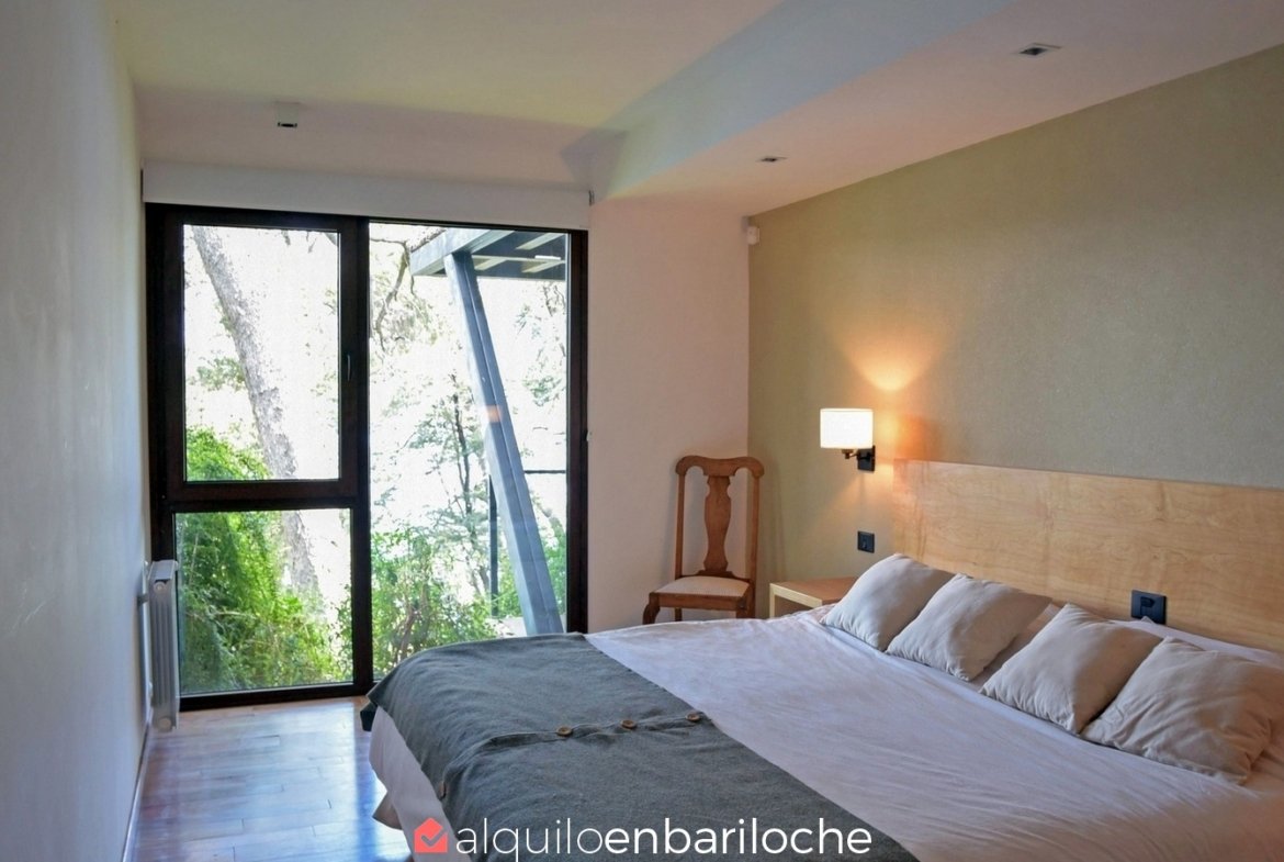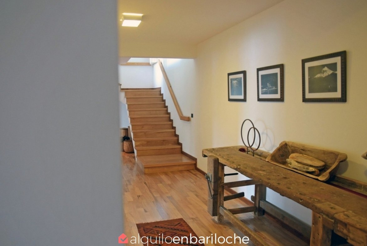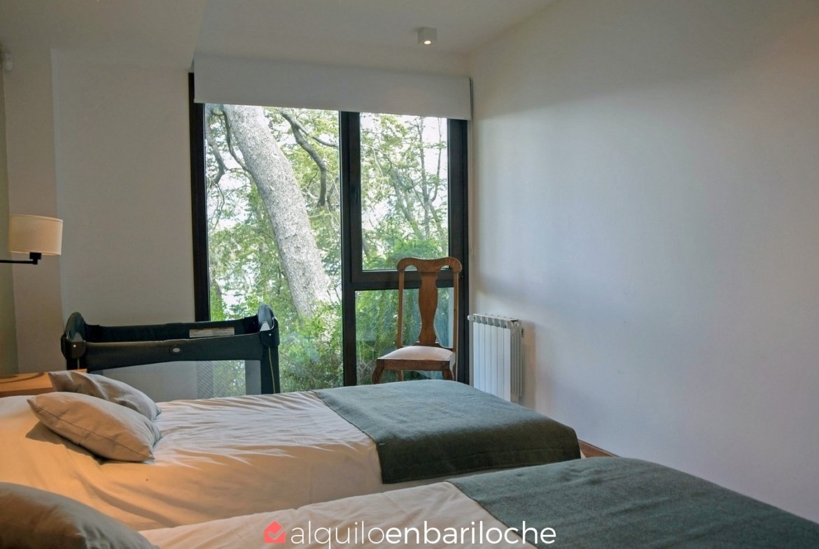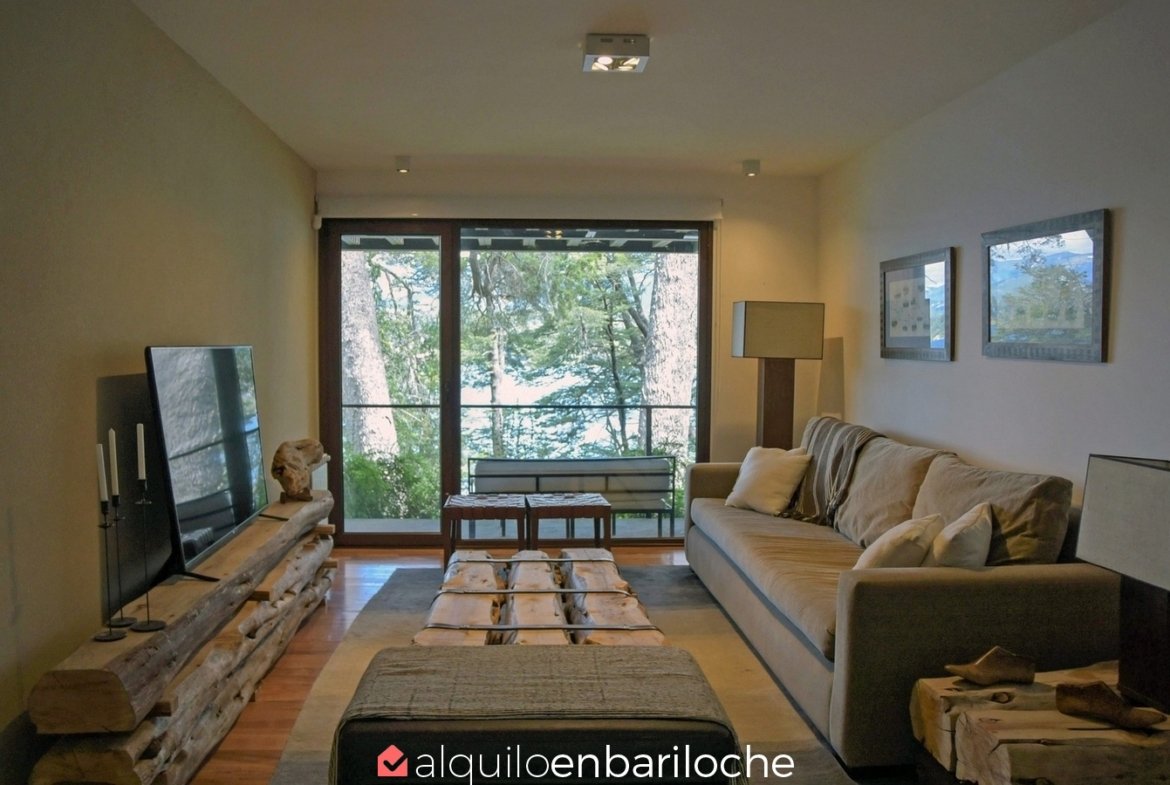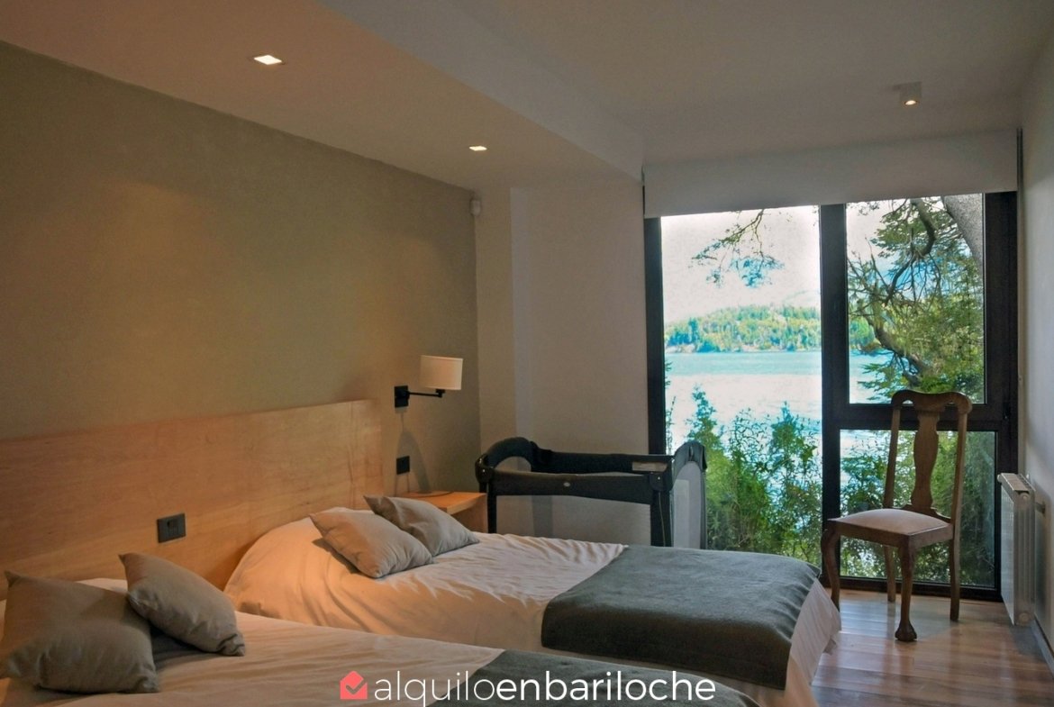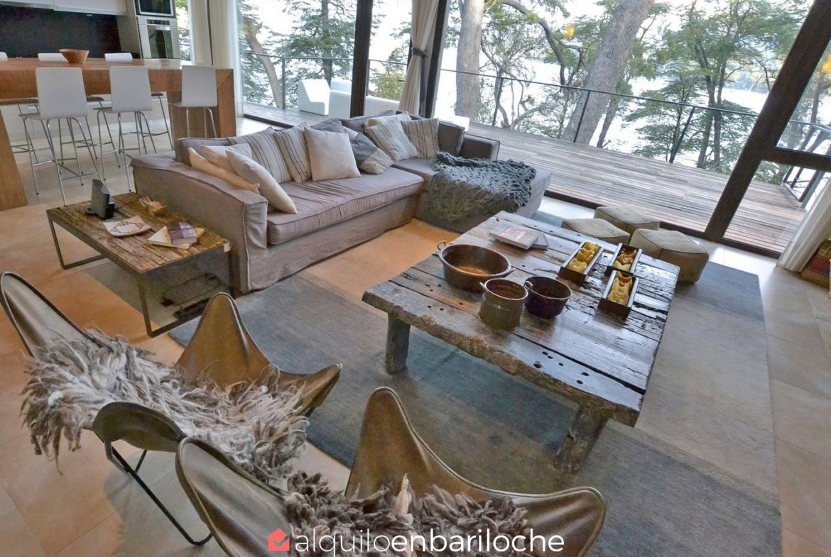 En la exclusiva Península de San Pedro, esta residencia de tres plantas frente al lago Nahuel Huapi ofrece seis dormitorios, un amplísimo deck con vistas panorámicas y acceso a la playa. Ideal para familias de hasta 12 personas que buscan confort, privacidad y conexión con la naturaleza en Bariloche.